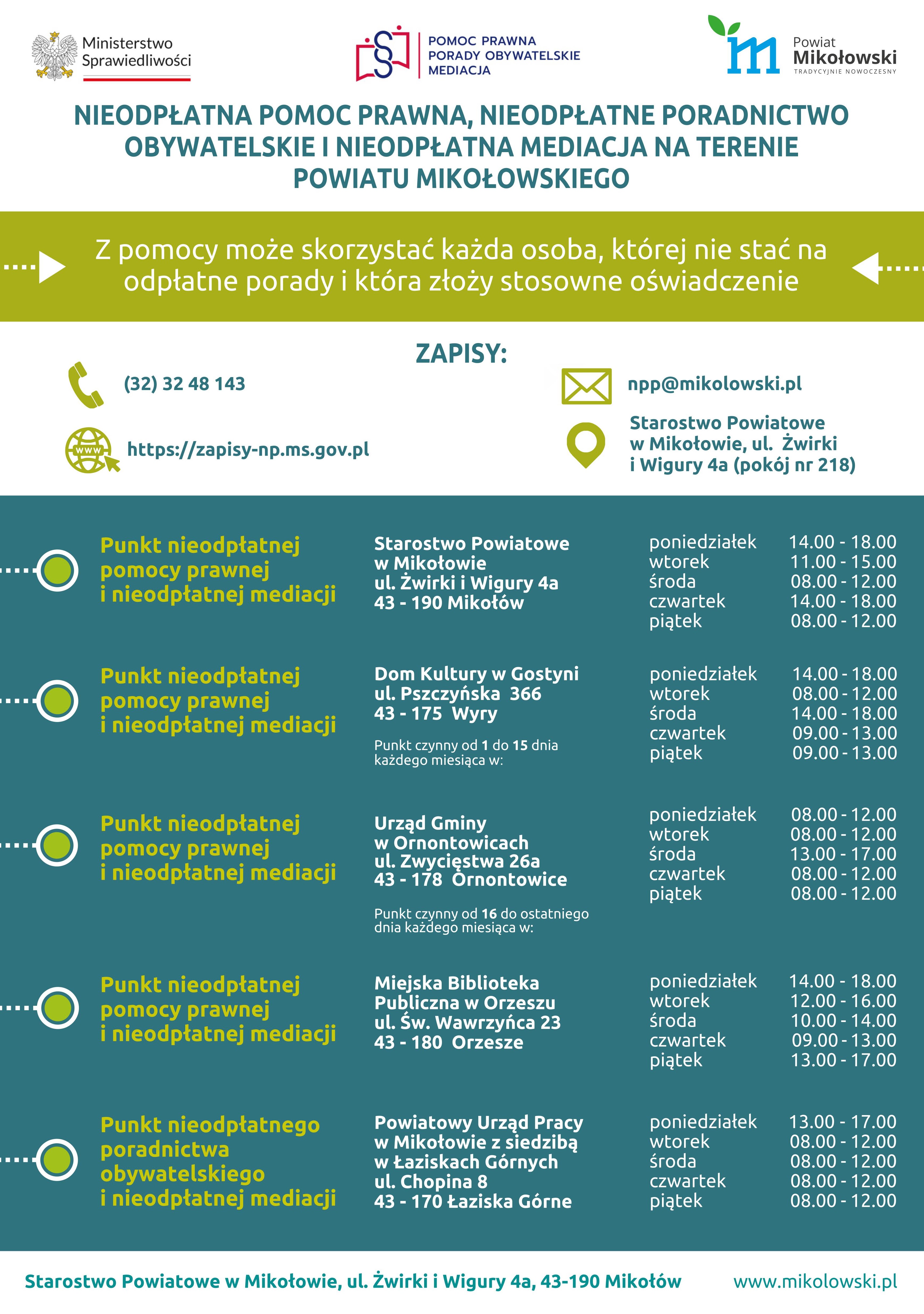 W celu przeciwdziałania zagrożeniom związanym z wirusem COVID-19 informujemy, że wszystkie punkty nieodpłatnej pomocy prawnej i nieodpłatnego poradnictwa obywatelskiego zlokalizowane na terenie powiatu mikołowskiego od dnia 20 grudnia 2021 r. rozpoczynają funkcjonowanie tylko i wyłącznie w formie zdalnej do odwołania. Porady udzielane będą za pośrednictwem środków porozumiewania się na odległość tj. telefonicznie, za pomocą poczty elektronicznej lub komunikatora internetowego, w dotychczasowych godzinach pracy punktów.